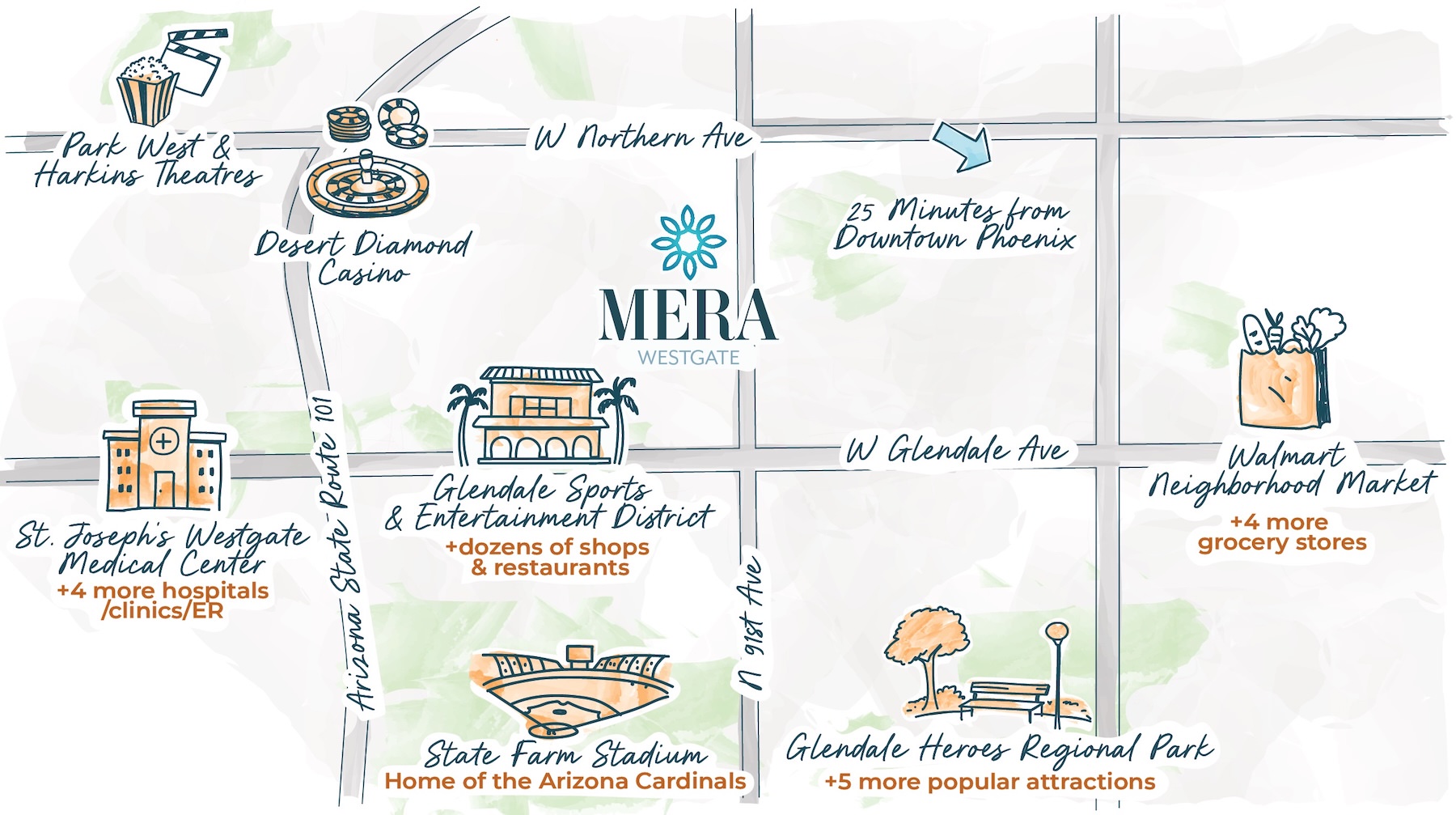 Here at Mera, your apartment amenities are crafted to invite connection, inspiration, and enjoyment. Whether you’re sharing stories on the poolside sun deck, enjoying the Entertainment District, or cooking a cherished recipe in your new, modern kitchen, simple moments become meaningful. We take care of everything from the walls to the weeds, so you can focus on the things that truly matter - connecting with your neighbors, creating new memories and discovering your greater Glendale community.